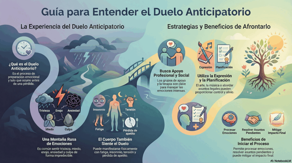 A nivel emocional, el duelo anticipatorio puede manifestarse a través de una amplia gama de sentimientos, incluyendo tristeza, miedo, enojo, ansiedad y culpa. Estas emociones pueden aparecer y desaparecer de manera impredecible, sumiendo a la persona en una montaña rusa emocional. A nivel físico, es común experimentar síntomas como pérdida de apetito, tensión, fatiga e insomnio, lo que resalta cómo el duelo anticipatorio afecta integralmente a la persona.