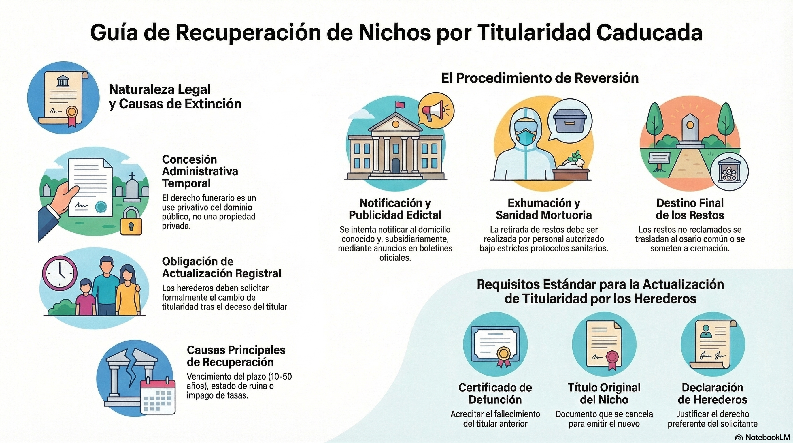 La retirada de nichos por titularidad caducada no es una medida arbitraria, sino un procedimiento regulado por la legislación administrativa y sanitaria.