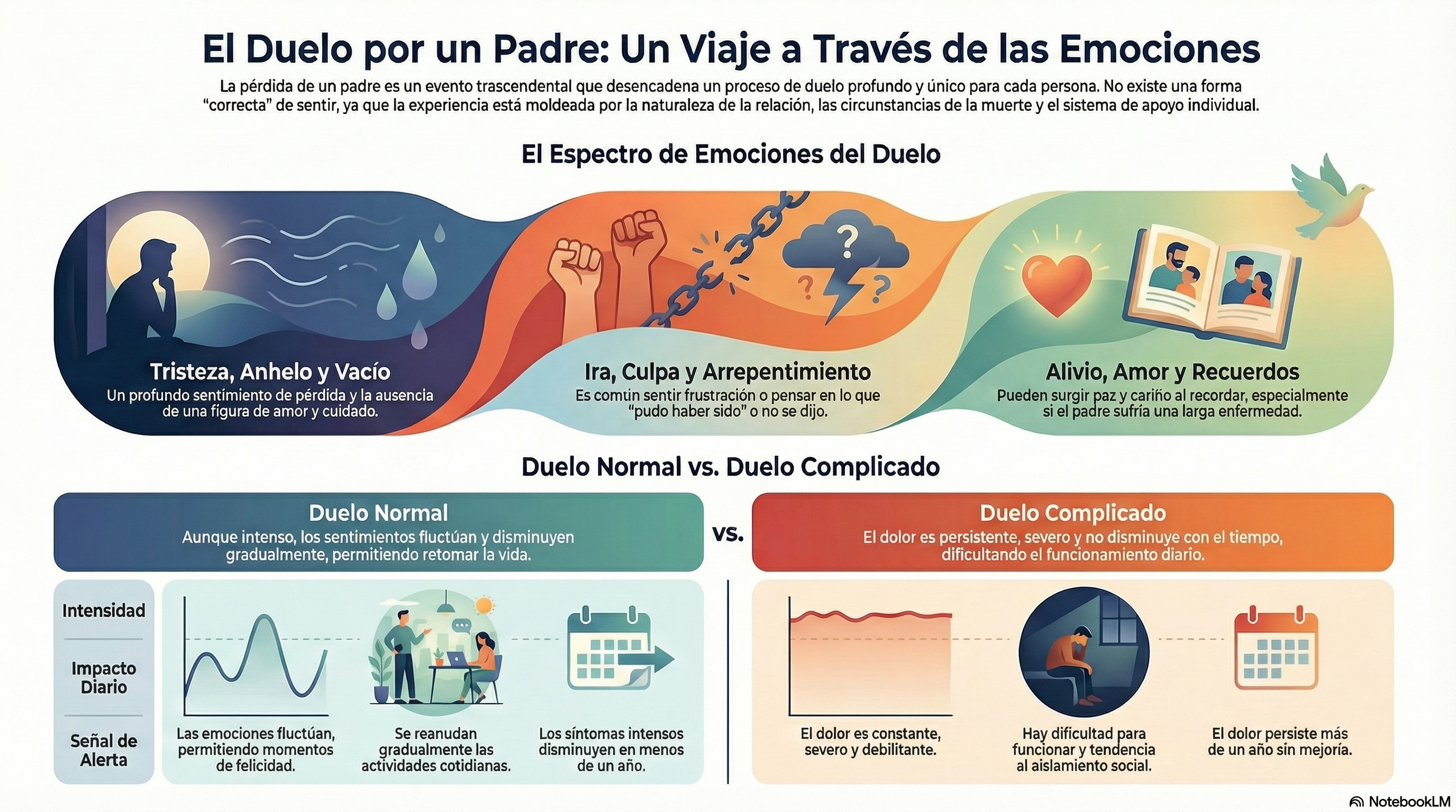 El duelo por la pérdida de un padre es una experiencia profundamente personal y multifacética. La investigación indica que no existe una forma «correcta» de sentir o una línea de tiempo predeterminada para la curación. Las emociones experimentadas pueden variar ampliamente, desde la tristeza y el shock iniciales hasta la ira, la culpa, el amor e incluso el alivio, influenciadas en gran medida por la naturaleza de la relación con el padre fallecido. Es crucial recordar que cada viaje de duelo es único y debe abordarse con paciencia y autocompasión. Buscar el apoyo de seres queridos, participar en el autocuidado y considerar la ayuda profesional a través de la terapia de duelo o grupos de apoyo son pasos valiosos para afrontar el dolor. Las perspectivas culturales y religiosas pueden ofrecer consuelo y un marco para comprender la muerte, mientras que reconocer la diferencia entre el duelo normal y el complicado puede ayudar a las personas a buscar la ayuda adecuada cuando sea necesario. A través de los testimonios personales, se hace evidente que, aunque el dolor de perder a un padre puede ser inmenso, también existe la posibilidad de encontrar formas de honrar su memoria, adaptarse a la pérdida y, finalmente, encontrar un camino a seguir.
